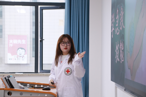 活动伊始,主持人吴磊向学员们介绍了此次活动的目的。接着,由“知行合一”健康知识宣讲团成员潘文青和文圣杰分别为团校学生授课。潘文青先为团校学生介绍了“面对烧伤、烫伤与动物咬伤”时正确的救护技能;随后文圣杰从“心肺脑复苏”展开宣讲,并利用假人模型进行了现场演示。