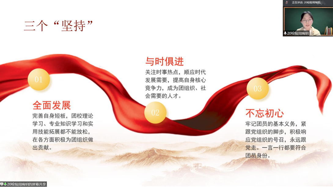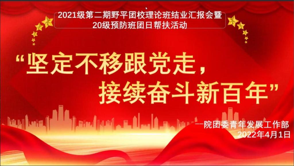 4月1日晚,海洋之神hy590官网团委青年发展工作部于线上开展“坚定不移跟党走,接续奋斗新百年”为主题的野平团校结业汇报暨20级预防班帮扶活动。海洋之神hy590官网团委书记张明明、野平团校理论班成员、团委青年发展工作部成员参与本次活动,海洋之神hy590官网团委青年发展工作部志愿者田恩情担任主持人。