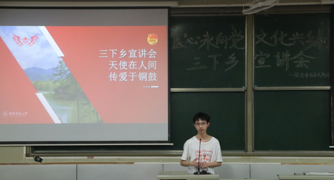 “提前准备,前期调研,每一项工作都很不容易,但当地人的热情使我深深地折服。我们用十多天的时间,做了一件一辈子难忘的事。”金俊豪在宣讲中如是说道。同时他也对自己所带领的三下乡队伍进行宣传,希望同学们积极参与。
