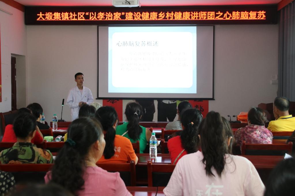 会议伊始,团队成员们提前赶到宣讲场地,布置好所需仪器设备,并为前来听讲的村民安排好座位。此次健康知识宣讲以“心肺脑复苏”为主题,文圣杰简单普及了心肺脑复苏的概念及其挽救生命的重大意义。他介绍了数个因心搏骤停而死亡的典型病例,通过实例向村民们强调了非医务人员专业知识缺乏是成功心肺脑复苏的障碍之一。随后,他重点讲解了心肺脑复苏的救治流程,用专业知识传授村民如何评估环境、判断意识、呼叫求助、病情识别、胸外按压、开放气道、人工呼吸、反复压吹、判断效果等一系列救治步骤。他也通过对人体模型的实际操作生动形象地展示了胸廓外部按压方法和注意要点。同时,他表示在现实生活中大多数人属于协助救援者,所以紧接着教授了心肺脑复苏过程中协救者的几大任务,如确保环境安全、及时拨打120、拿AED等。最后,他向村民们强调不能对正常人实施心肺脑复苏救治,否则会适得其反甚至造成事故。