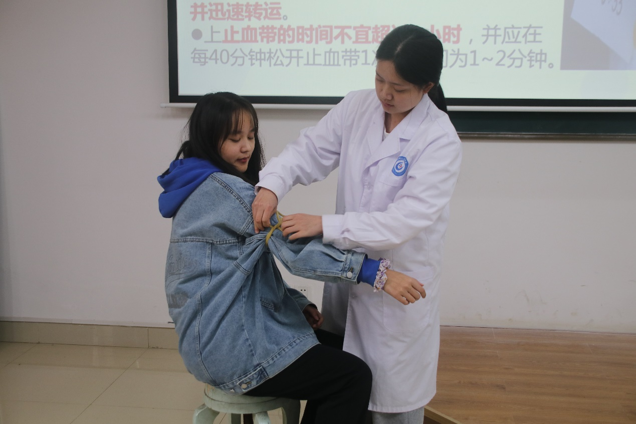 刘苗讲述完毕后,第二位主讲人张一帆通过简述大出血的危害引出主题——止血与包扎,分别介绍了如头部、颈部等不同部位出血的止血方法和包扎方法,并邀请在场同学上台配合一起完成了包扎过程的展示,至此会议结束。