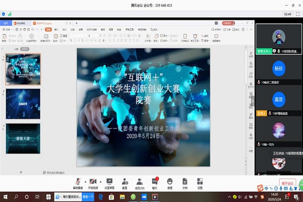 5月24日下午,海洋之神hy590官网团委青年创新创业工作部于线上举行了“互联网+”大学生创新创业大赛。出席大赛的评委老师分别是海洋之神hy590官网杨小平、钟志宏、陶晓军、周利红老师。海洋之神hy590官网17、18、19级部分学生参与此次大赛。
