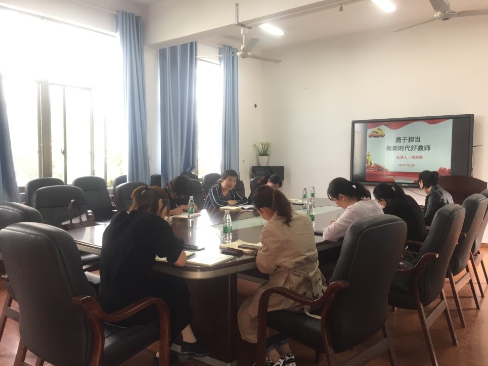 会上邓文艳副院长以“勇于担当、做新时代好教师”为主题,给护理支部党员讲了一堂生动的专题党课。邓文艳副院长以习近平总书记向全国广大教师提出的“三个牢固树立”思想为指导,从党和人民满意的好教师应当具备的“四有”“四个引路人”“四个相统一”的标准出发,结合学院具体情况,指出“担使命、履职责,矢志为民服务”要落实到具体行动中。作为新时代的高校工作者,要牢记党的初心使命和为人民服务的根本宗旨,老师应该树立敢于担当的信念,培养敢于担当的能力、提升自身教学、科研能力,加强师资队伍建设,构建一个有凝聚力的团队,用实干担当交出新时代人民满意的答卷。